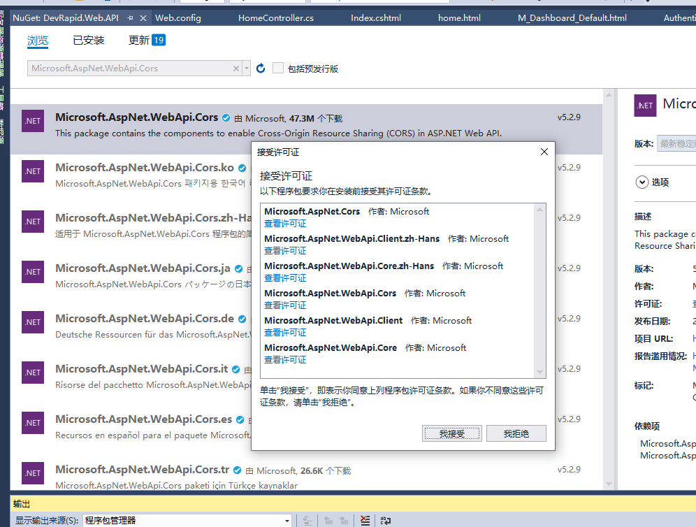2、找到 Microsoft.AspNet.WebApi.Cors 包,并安装。