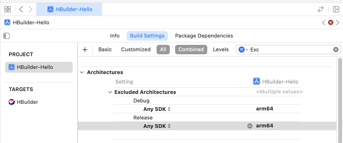 修改很简单,分别在 Architectures 的 Excluded Architectures 的 Debug 和 Release 下新增 AnySDK 为 arm64 即可
