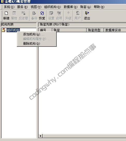 3、进入金蝶K/3帐套管理系统后,在“组织机构”上右键“添加机构”