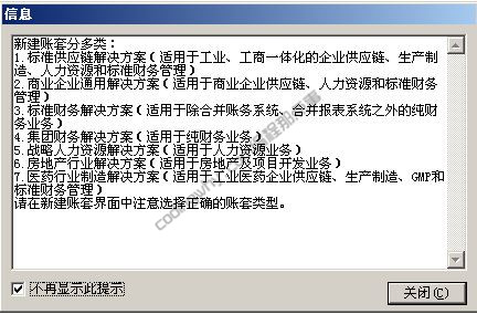 6、一般新装的K3会出现新建账套分多类说明这样一个对话框,你可以勾选“不再显示此提示”后单击“关闭”按钮。