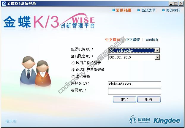 2、进入”金蝶 K3 WISE创新管理平台“登录界面。”组织结构“、”当前帐套“就是在K3帐套管理里面配置的帐套,需要注意的是,K3管理员默认的用户是administrator,密码默认是空。